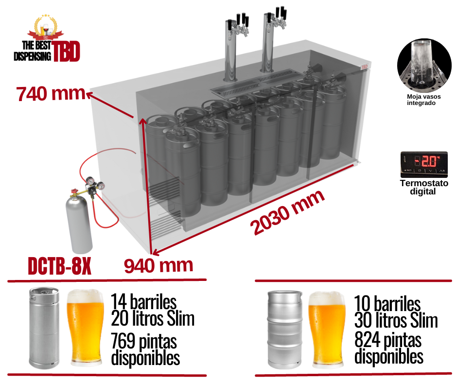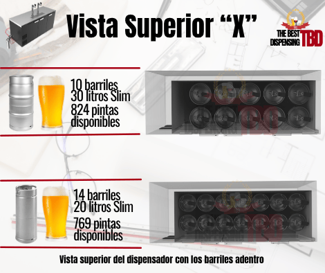 Hasta 17 barriles de 20 L o 12 barriles de 30 L en cámara; almacena frío solo el volumen útil del gabinete para eficiencia y respuesta rápida. (thebestdispensing.com)