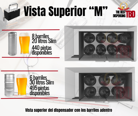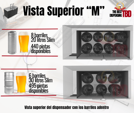 El dispensador de cerveza Serie M es uno de los más vendidos por su capacidad de almacenamiento y estabilidad en servicio. Permite alojar hasta 8 barriles de 20 L slim o 6 barriles de 30 L slim para que siempre tengas barriles de reserva ya fríos y listos para conectar. Así garantizas que la cerveza artesanal se mantenga a 0-4 C, preservando aromas y sabores desde el primer vaso.