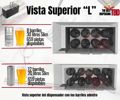 L con 6 servicios: tendrás 6 barriles conectados y 6 barriles de reserva fría. Cuando se termina uno, desconectas, conectas el que ya está frío y vuelves a meter otro a enfriar. Flujo continuo, sin picos de espuma por barriles calientes.