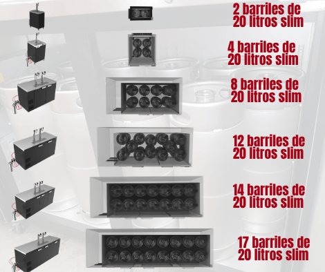 Cámaras con capacidad desde 8 hasta 17 barriles de 20 L slim o 6 a 12 barriles de 30 L slim, de acuerdo con el modelo (L, X o XL).