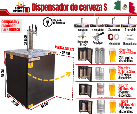 En nuestro catálogo encontrarás dispensadores de cerveza de barril desde la Serie S (almacena hasta 4 barriles slim de 20 L) hasta la Serie XL (almacena hasta 17 barriles de 20 L). Tenemos equipos que van desde 64 cm de frente hasta 2.46 m de largo; la profundidad es, en general, 74 cm (disponible versión menos profunda bajo pedido).