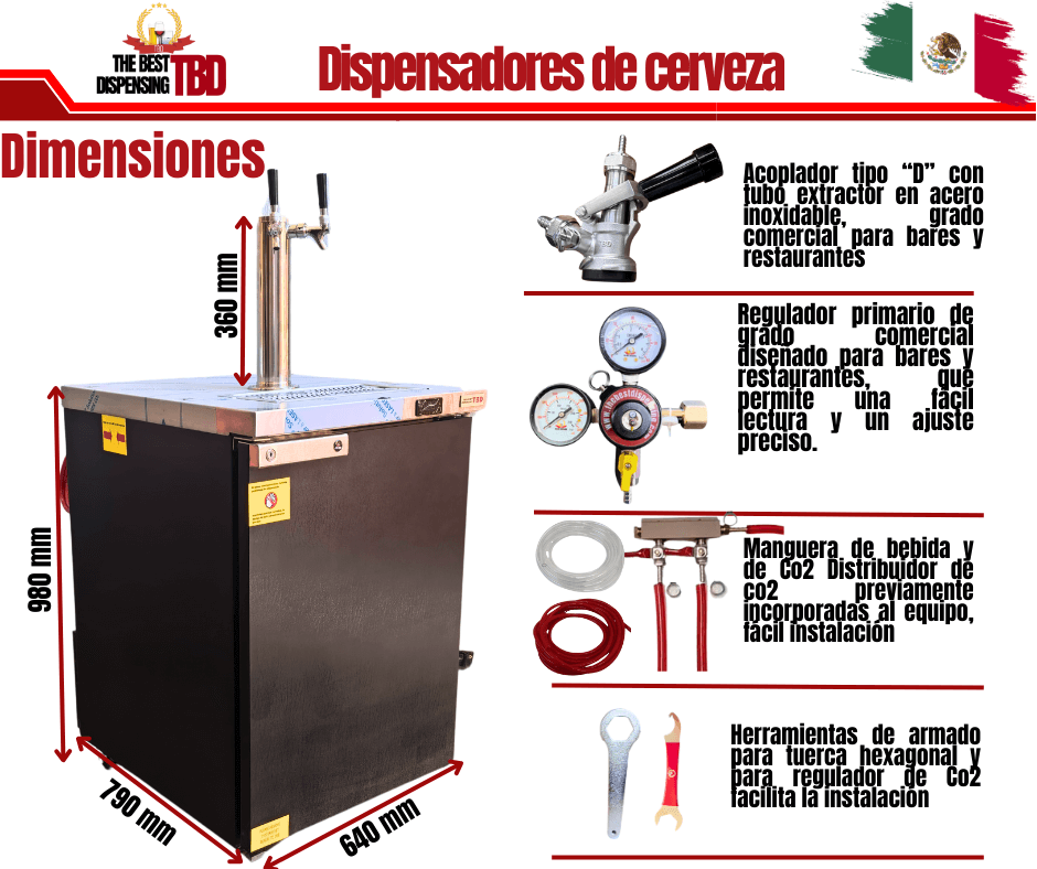 En el caso de los dispensadores de cerveza TBD, los equipos están diseñados como sistemas completos para operación profesional, es decir, incluyen los componentes necesarios para conectar el barril, regular la presión y servir la cerveza correctamente desde el primer día.
