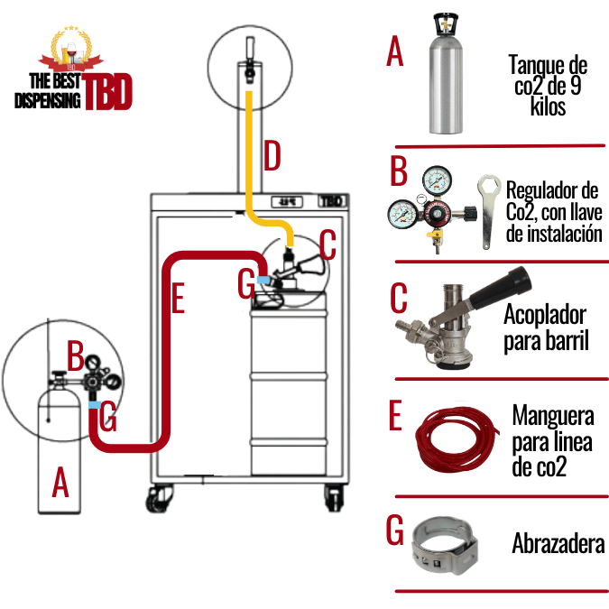 Entremos en detalle, primero vamos definiendo de arriba abajo que debe de incluir el dispensador de cerveza, en la parte inferior podrá ver una imagen detallada de cada pieza para identificarla, siempre soliciten la ficha técnica para conocer más sobre el dispensador de cerveza de barril, si solo necesitas comprar las piezas que te hacen falta en cada producto te dejamos donde la puedes comprar para facilitarte la vida.