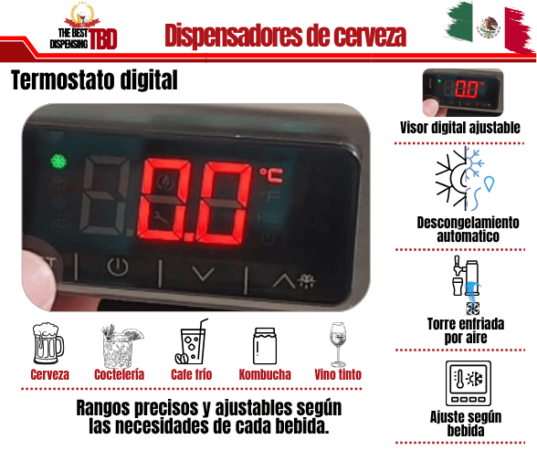 El dispensador cuenta con un sistema de refrigeración diseñado específicamente para enfriar el barril ubicado en su interior. Este sistema optimiza la temperatura del espacio donde se alojan los barriles, asegurando que la cerveza se mantenga a una temperatura constante desde el primer vaso hasta el último.