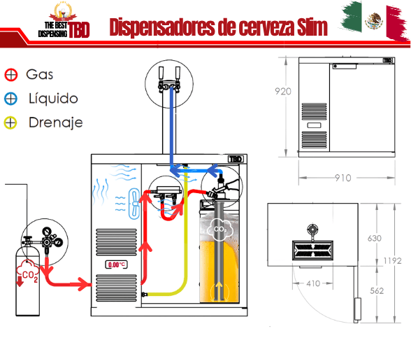 El dispensador de cerveza de barril refrigerado tamaño “Slim” es único en mercado tiene una mejor profundidad y altura por lo que es perfecto para incorporar en barras de bebidas donde el espacio es limitado con dimensiones exteriores en milímetros 930 x 640 x 930 (frente – fondo – altura) robusto, durable y extremadamente fiable para el dispensado de cerveza de barril, se enfría solo el lugar que ocupan los barriles.