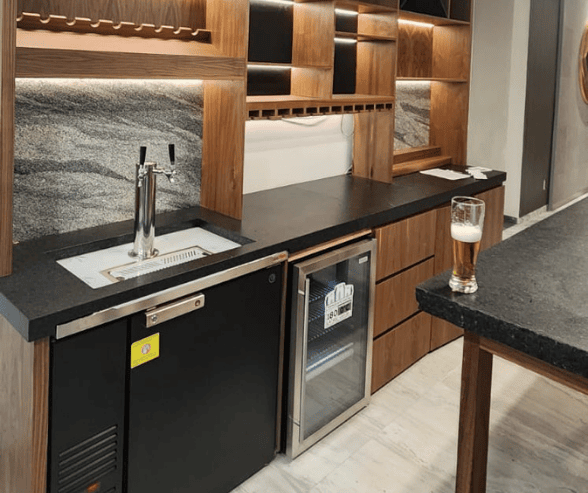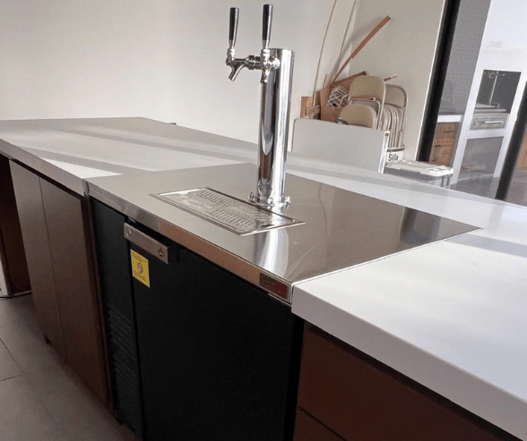 Es importante considerar que la instalación del dispensador de cerveza dependerá del diseño de cada arquitecto, en este caso de lado izquierdo se colocó a nivel de barra, es decir quedo expuesta la parte superior del equipo porque fue posible aprovechar él, recoge gotas que está incorporada en el dispensador de cerveza.
