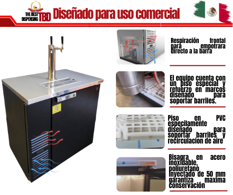 - Parte superior de acero inoxidable resistente calibre 18, con charola incorporada al dispensador de cerveza con drenaje interno, Interior construido con paredes de acero inoxidable de alta resistencia con piso de acero inoxidable aprobado por la NSF con esquinas cóncavas. Rejilla de piso protector en PVC desmontable, permite circular el aire frío por arriba y por abajo del barril de cerveza. Cuenta con puerta de acero cubierta de vinilo negro bastante resistente, cerraduras con llave para evitar el uso en horas no deseadas, por puerta con juntas magnéticas extraíbles sin herramientas; puertas con dispositivo de cierre automático con opción de apertura permanente a 120° para facilitar la carga y descarga de barriles, Las aberturas de las puertas tienen tiras de protección de plástico para retardar la formación de condensado, cuenta con un aislamiento de poliuretano sin CFC de 50 mm y bisagras en acero inoxidable de máxima durabilidad, realmente un gabinete robusto y realmente hecho para durar.