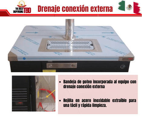 El dispensador de cerveza está equipado con una charola incorporada, que presenta una rejilla desmontable de acero inoxidable. Este diseño proporciona una apariencia limpia, evitando la exposición de mangueras o instalaciones visibles, ya que todos los componentes quedan ocultos dentro del gabinete, tal como se debe.