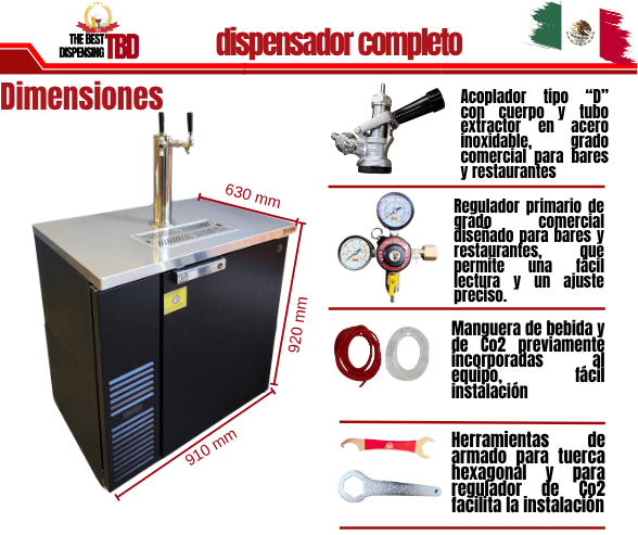 - Los dispensadores de cerveza de barril the best dispensing cuenta con todo el sistema de dispensado completo que otras marcas de enfriadores de cerveza de barril no tiene de línea, incluye un acoplador "D" o “S” para cada línea. Que son lo más común utilizado en México, también encontraras que incluye mangueras de línea de co2, en su caso distribuidor de co2, regulador primario, y en tanque de co2 de 5 libras, solo en los dispensadores de cerveza de 1 y 2 servicios, herramienta de armado de torre, empaques para líneas de bebidas, y empaques de repuesto para acoplador y grifos
