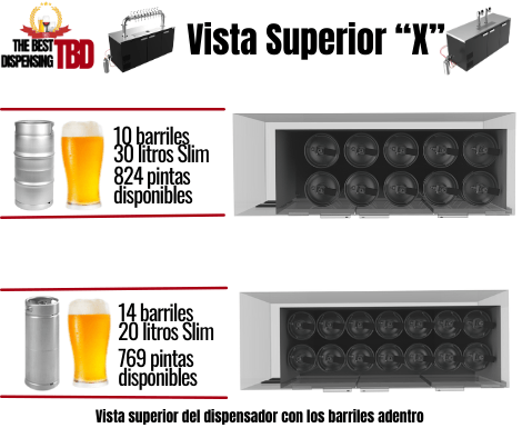 Máxima capacidad almacenamiento hasta 14 barriles de 20 litros slim o 10 barriles de 30 litros slim.