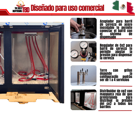 Este dispensador de cerveza de barril incluye dos torres de cerveza, ambas con dos servicios cada una. Cada torre cuenta con su manguera de bebida, tuerca y colilla. En el interior es necesario instalar un distribuidor de CO₂ de tres servicios, al igual que en los modelos de mayor tamaño.
