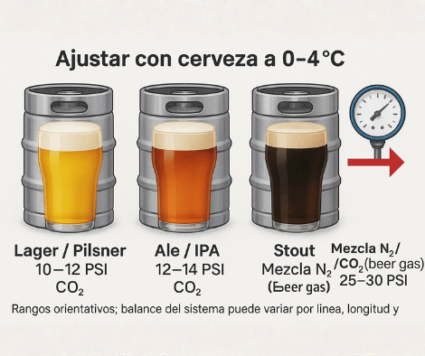 Cada estilo de cerveza requiere una presión distinta para equilibrar la carbonatación y la velocidad de flujo. Por ejemplo, las Lager ligeras necesitan menos gas que las IPA, que son más densas.